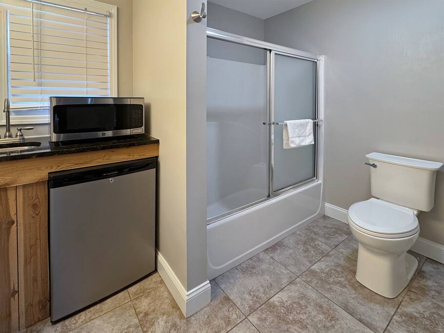 At the heart of the studio is a luxurious king-sized bed, positioned to provide a restful night's sleep in the quiet mountain air. The space is complemented by a full bathroom featuring a tub/shower combination, stocked with fresh towels and a starter set of toiletries to simplify your arrival.
