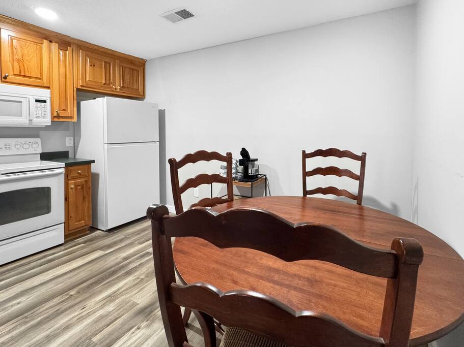 Unlike traditional hotel stays, Nacoochee features a fully equipped kitchen with a stove, oven, full-sized refrigerator, and microwave. Whether you’re brewing a morning roast at the Keurig station or preparing a locally inspired meal, you’ll find all the necessary cookware and dishes at your fingertips. For a breath of fresh air, step out onto your private covered patio. With seating for two and tranquil wooded views, it’s an ideal spot for an evening drink or a peaceful mountain breakfast.