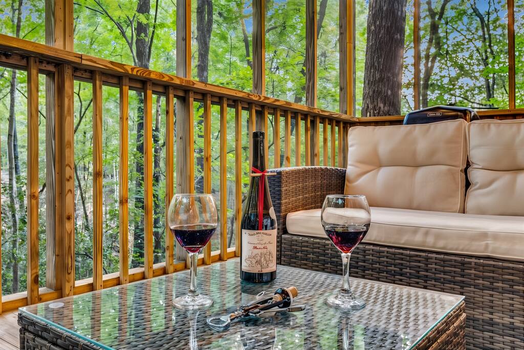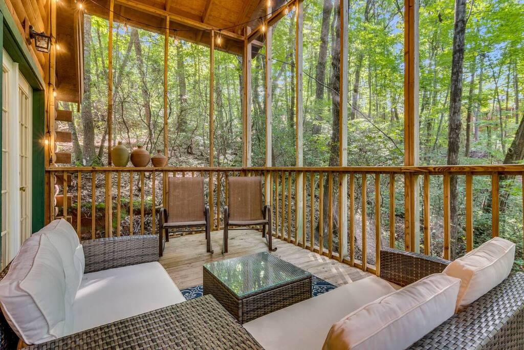 Step through the French doors to your private deck, an outdoor living room draped in twinkly lights and surrounded by the peaceful North Georgia woods. Relax on cushioned seating by the gas firepit, grill a local favorite on the BBQ, or simply enjoy the sounds of nature as the sun sets behind the trees. It is the perfect setting for a glass of local wine and uninterrupted conversation.