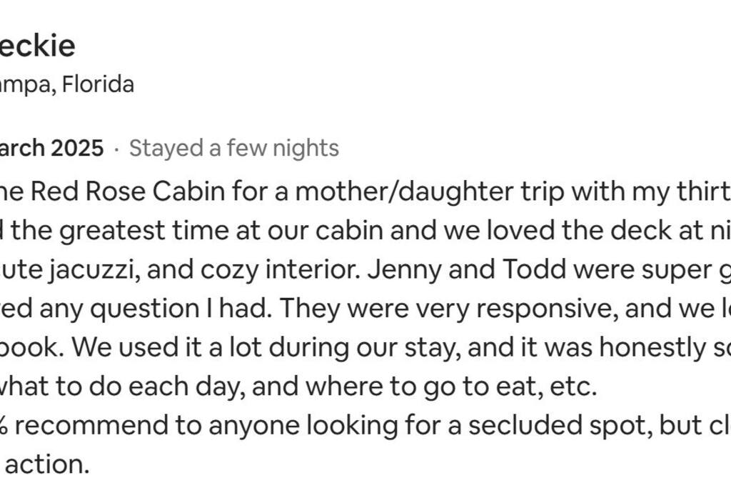 Professional & Local Support: While we give our guests plenty of space to enjoy the cabin privately, we are never out of reach. As Licensed Realtor hosts who live nearby, we—along with our trusted local team—are always just a quick message away. Whether you need a local recommendation for the best sunset view or require assistance at the property, we are here to ensure your stay is smooth, comfortable, and entirely stress-free.