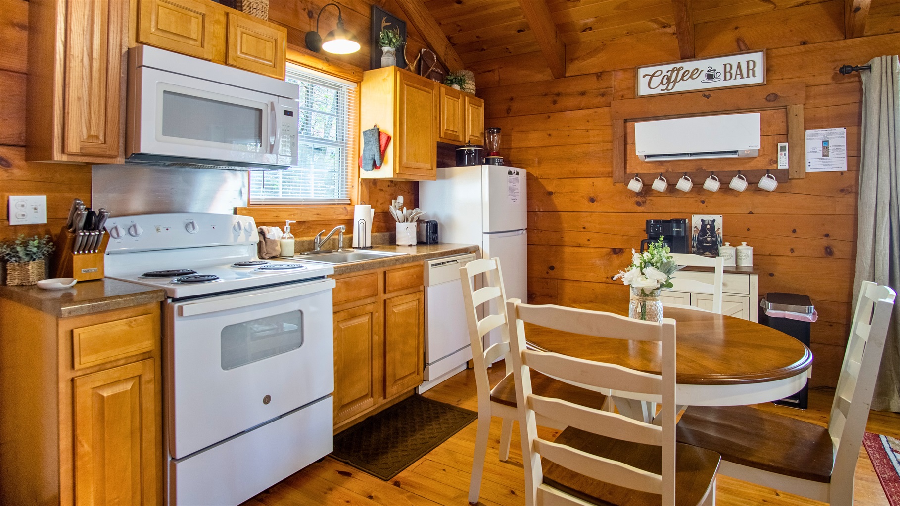 The fully stocked kitchen has everything you need to cook meals, from pots and pans to dinnerware and utensils. Brew your morning coffee on the deck and enjoy the quiet sounds of nature.