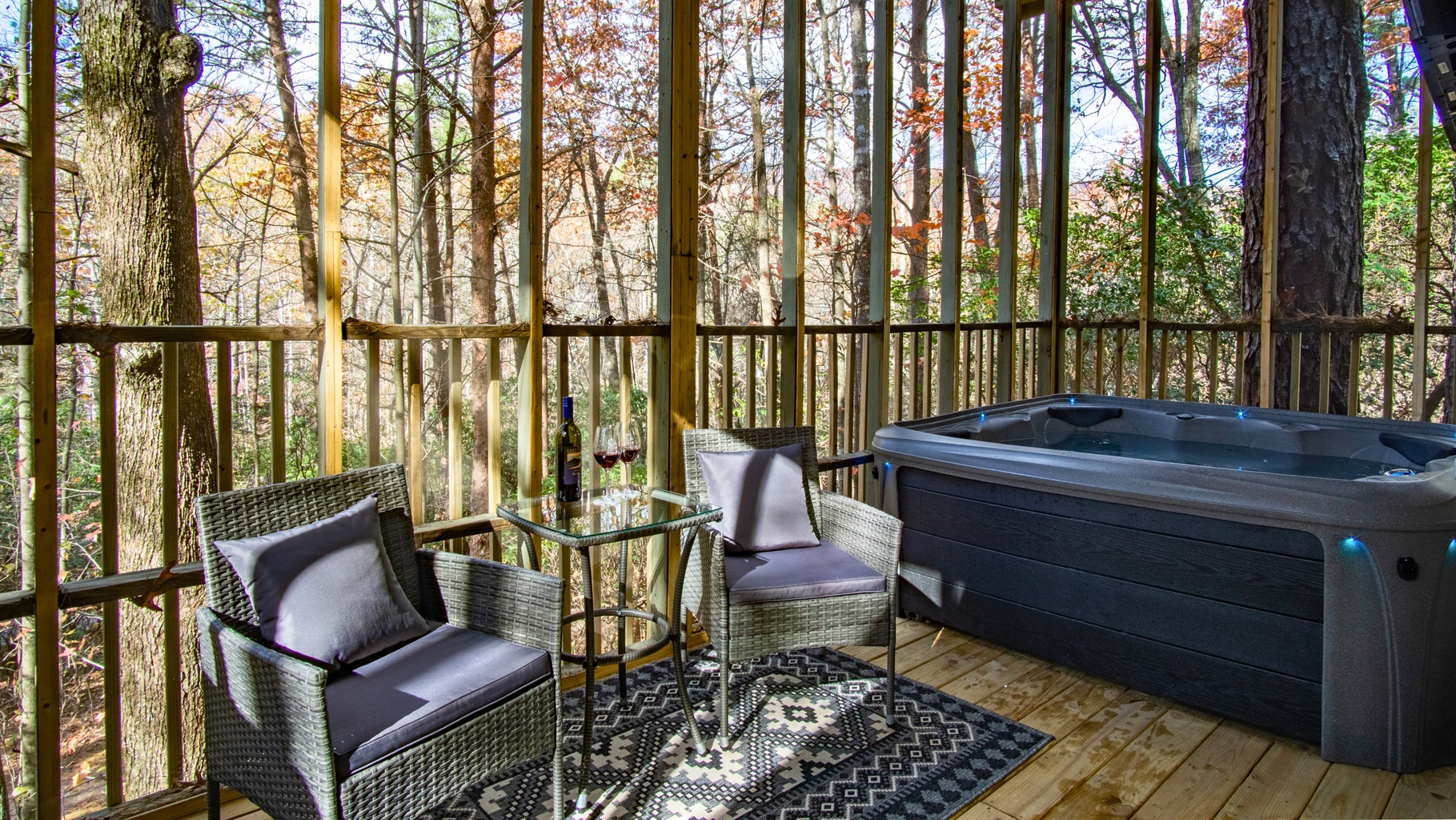 Step outside to your private screened-in porch. Here you’ll find the guest-favorite hot tub with outdoor Smart TV — a rare amenity in Helen-area cabins. Stream a movie, watch the big game, or soak in silence under the night sky. The deck also offers a gas grill, outdoor dining set, and rocking chairs for year-round enjoyment.